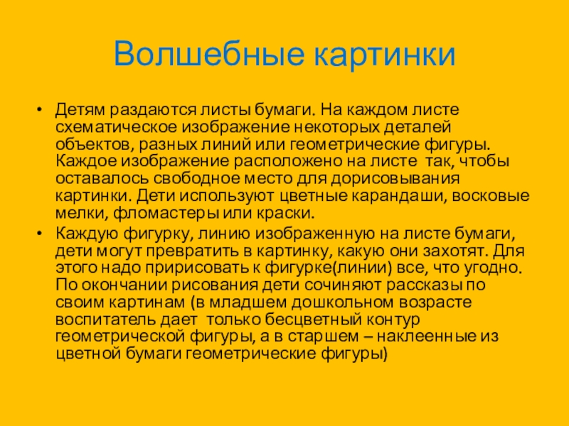 Каждую фигурку, линию изображенную на листе бумаги, дети могут превратить в картинку, какую они захотят. Для этого надо пририсовать к фигурке(линии) все, что угодно. По окончании рисования дети сочиняют рассказы по своим картинам (в младшем дошкольном возрасте воспитатель дает только бесцветный контур геометрической фигуры, а в старшем – наклеенные из цветной бумаги геометрические фигуры)