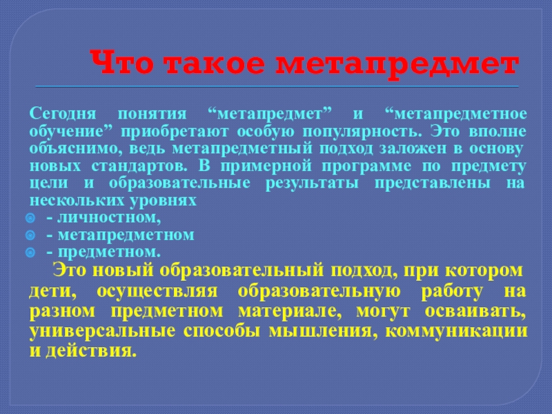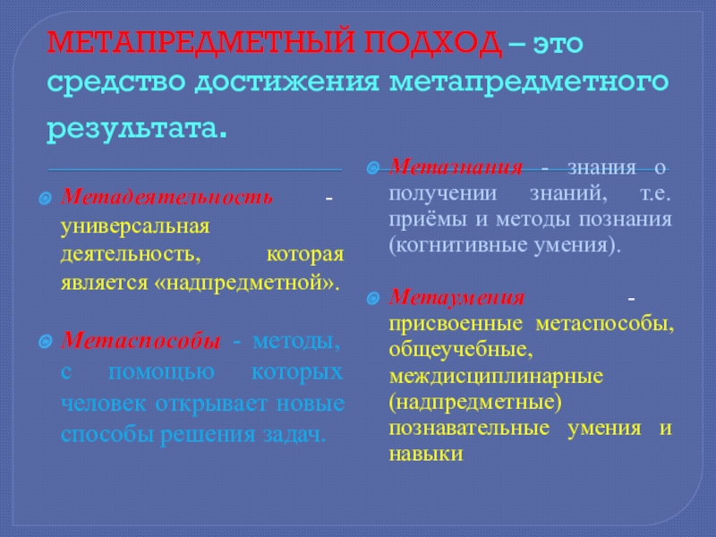 Метаумения - присвоенные метаспособы, общеучебные, междисциплинарные (надпредметные) познавательные умения и навыки