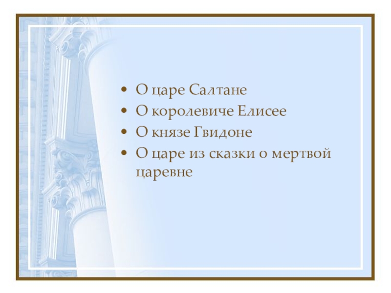 О царе СалтанеО королевиче ЕлисееО князе ГвидонеО царе из сказки о мертвой царевне