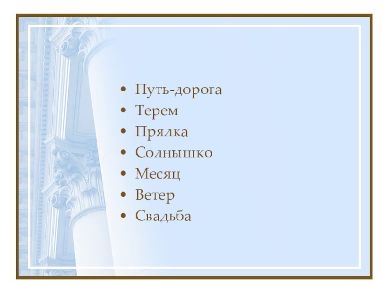 Путь-дорогаТеремПрялкаСолнышкоМесяцВетерСвадьба
