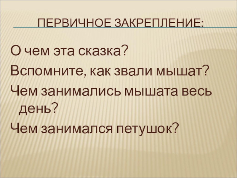 ПЕРВИЧНОЕ ЗАКРЕПЛЕНИЕ:О чем эта сказка? Вспомните, как звали мышат?Чем занимались мышата весь день?Чем занимался петушок?