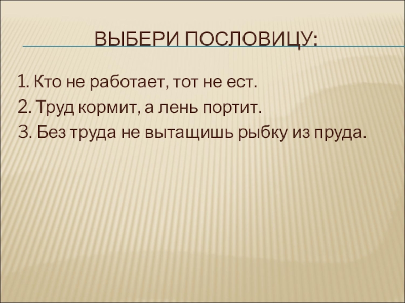 ВЫБЕРИ ПОСЛОВИЦУ:1. Кто не работает, тот не ест.2. Труд кормит, а лень портит.3. Без труда не вытащишь