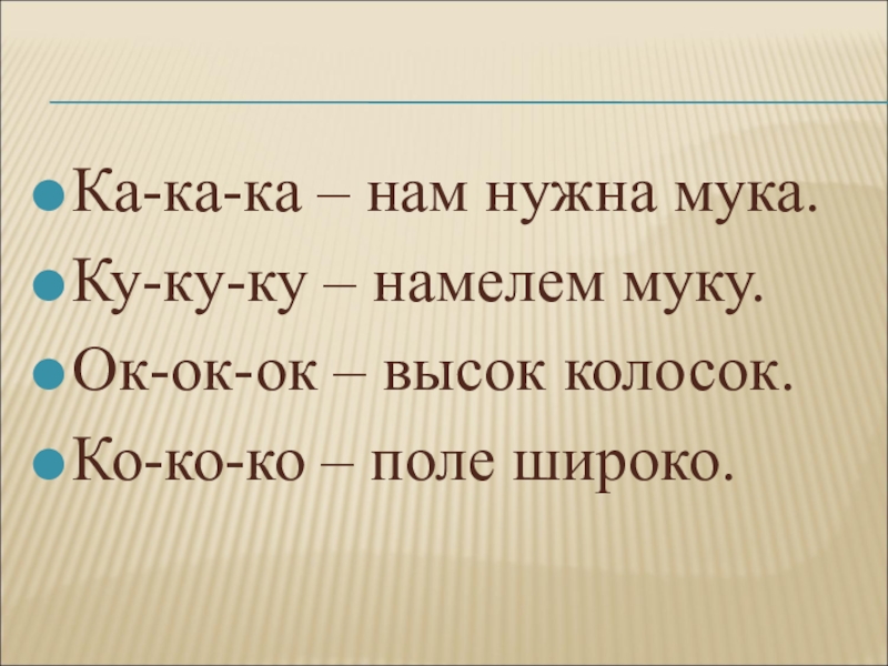 Ка-ка-ка – нам нужна мука.Ку-ку-ку – намелем муку.Ок-ок-ок – высок колосок.Ко-ко-ко – поле широко.