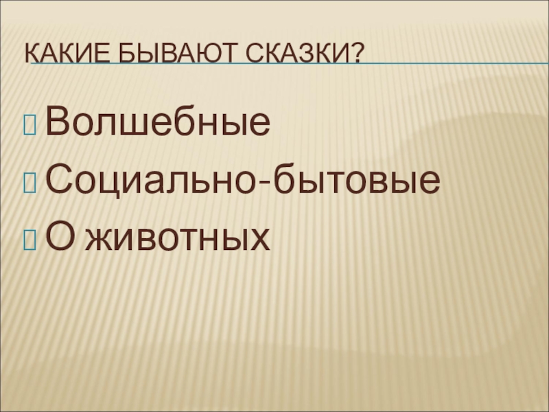 КАКИЕ БЫВАЮТ СКАЗКИ?ВолшебныеСоциально-бытовыеО животных
