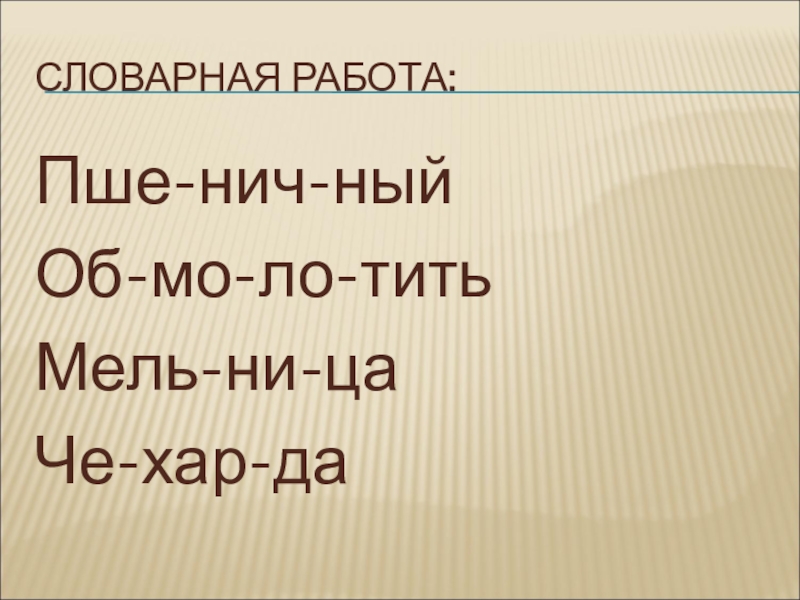 СЛОВАРНАЯ РАБОТА:Пше-нич-ныйОб-мо-ло-титьМель-ни-цаЧе-хар-да