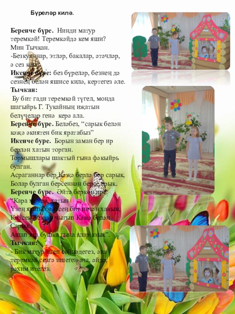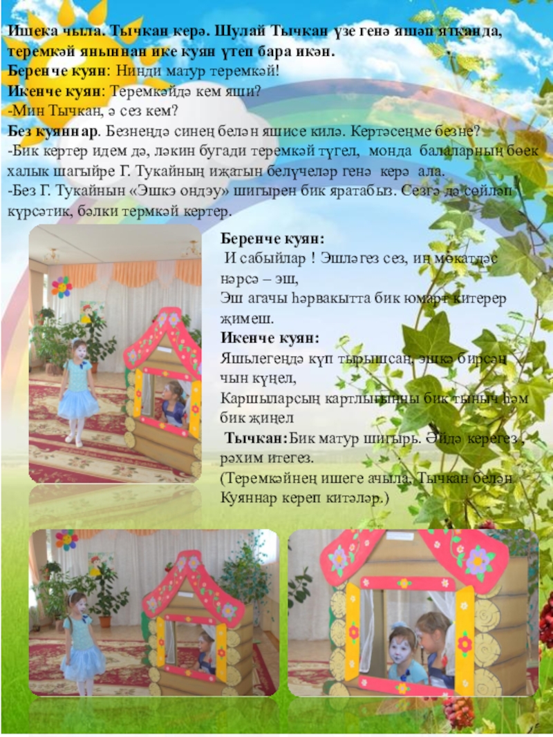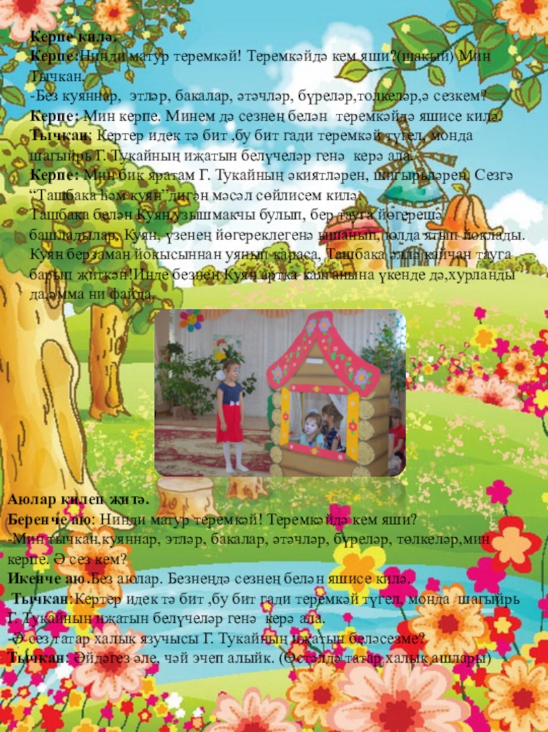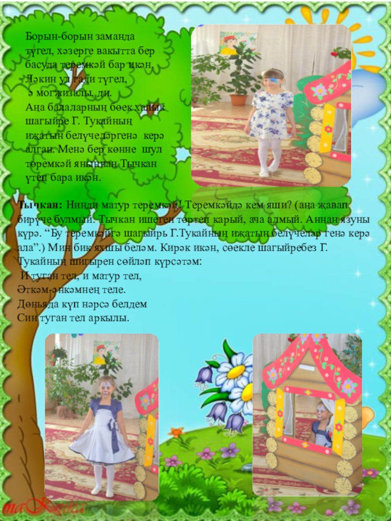 Тычкан: Нинди матур теремкәй! Теремкәйдә кем яши? (аңа җавап бирүче булмый. Тычкан ишеген төртеп карый, ача алмый. Аннан язуны күрә. “Бу теремкәйгә шагыйрь Г.Тукайның иҗатын белүчеләр генә керә ала”.) Мин бик яхшы беләм. Кирәк икән, сөекле шагыйребез Г.Тукайның шигырен сөйләп күрсәтәм: