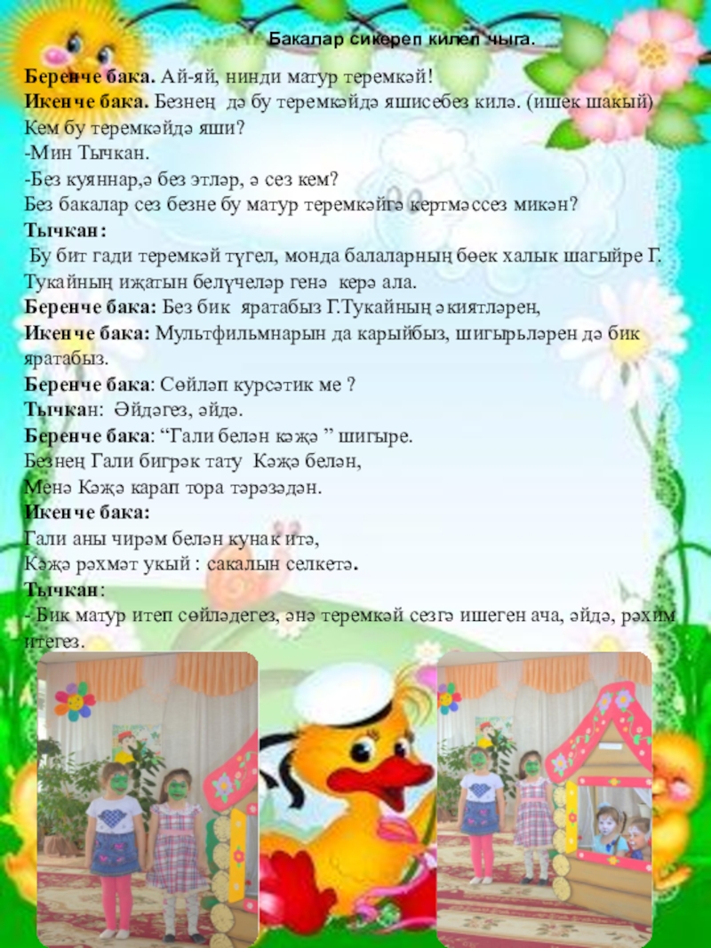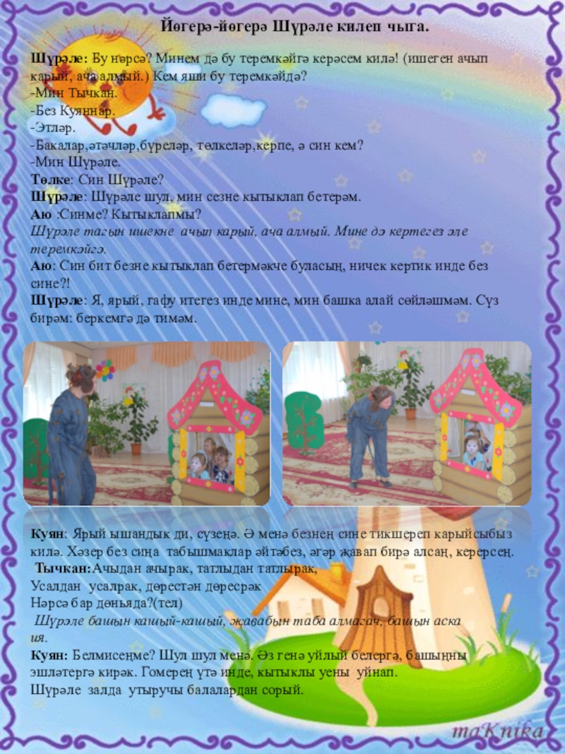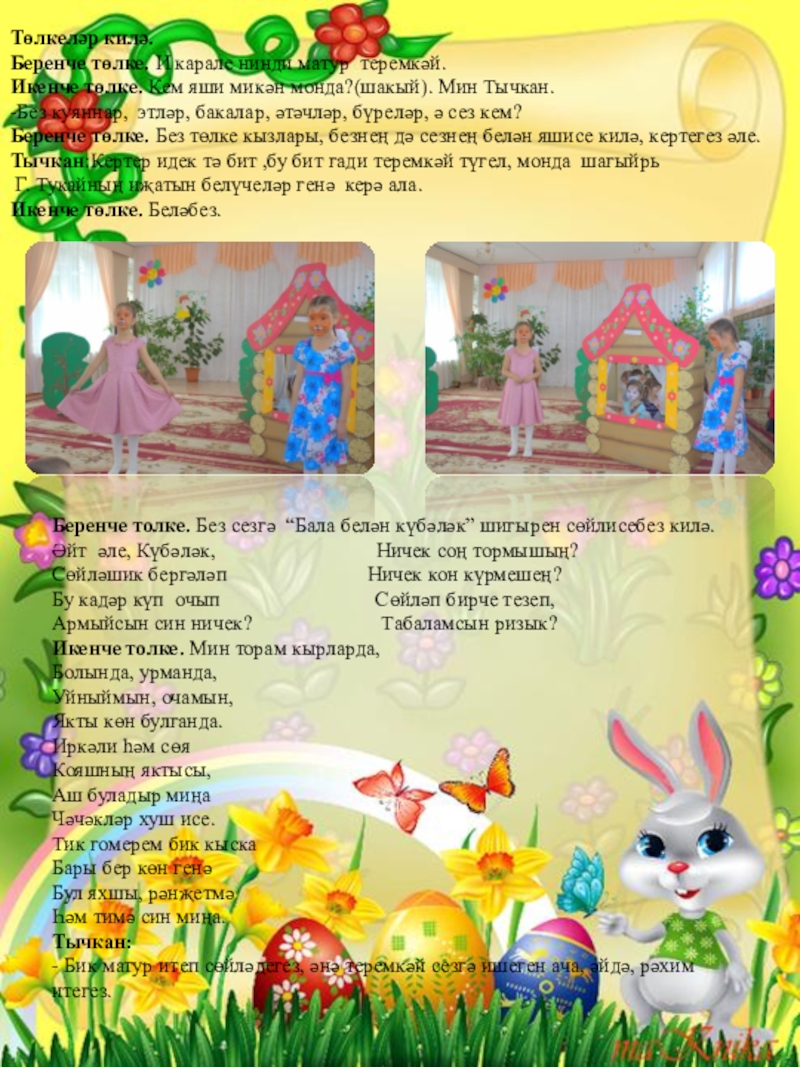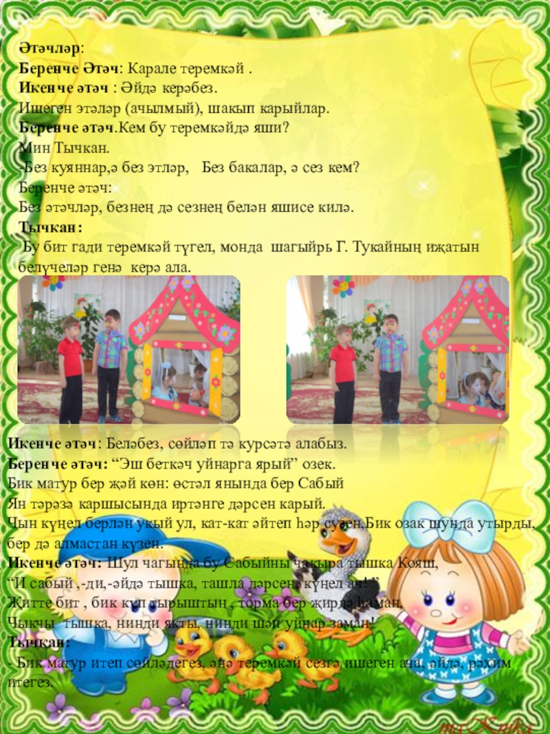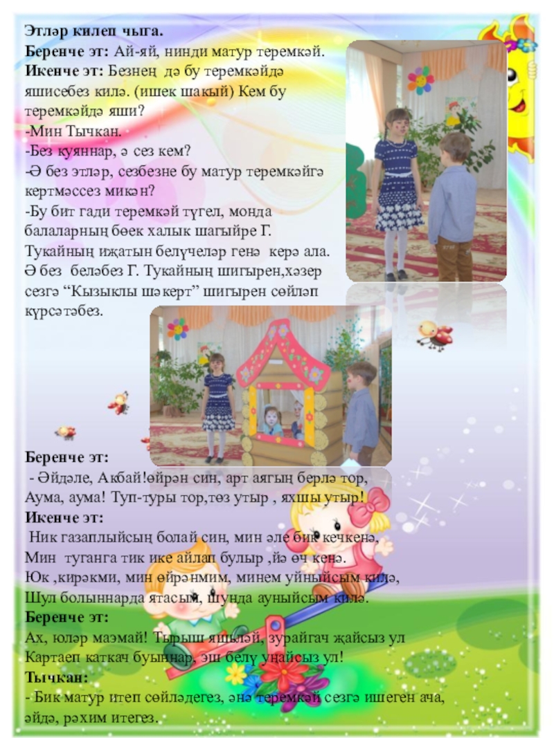 Тычкан: Нинди матур теремкәй! Теремкәйдә кем яши? (аңа җавап бирүче булмый. Тычкан ишеген төртеп карый, ача алмый. Аннан язуны күрә. “Бу теремкәйгә шагыйрь Г.Тукайның иҗатын белүчеләр генә керә ала”.) Мин бик яхшы беләм. Кирәк икән, сөекле шагыйребез Г.Тукайның шигырен сөйләп күрсәтәм: