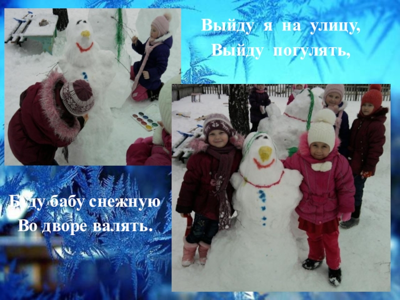 Выйду я на улицу,Выйду погулять,Буду бабу снежнуюВо дворе валять.
