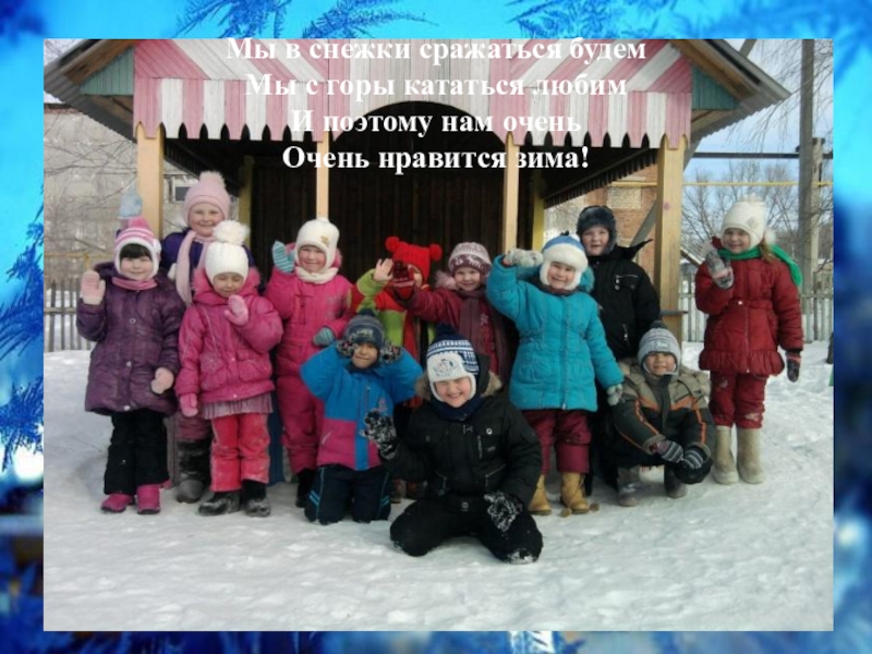 Мы в снежки сражаться будем Мы с горы кататься любим И поэтому нам очень Очень нравится зима!