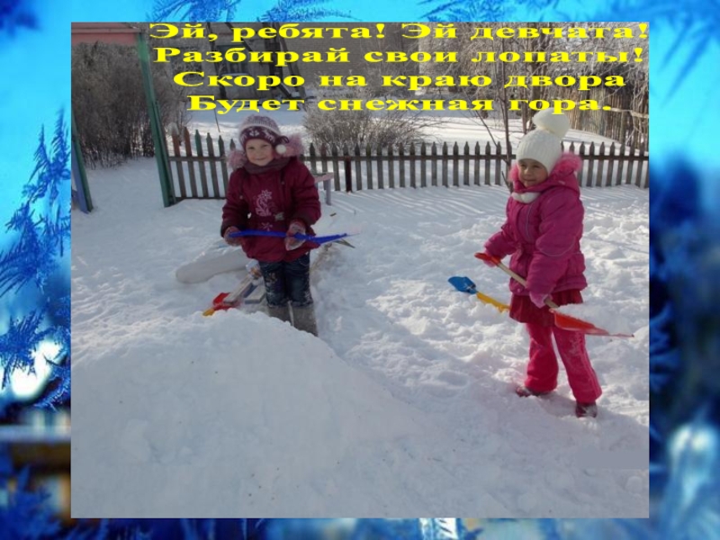 Слайд 8Эй, ребята! Эй девчата! Разбирай свои лопаты! Скоро на краю двора Будет снежная гора.