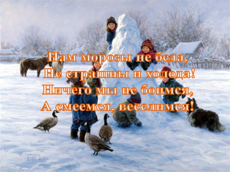Нам морозы не беда,   Не страшны и холода! Ничего мы не боимся, А смеемся, веселимся!