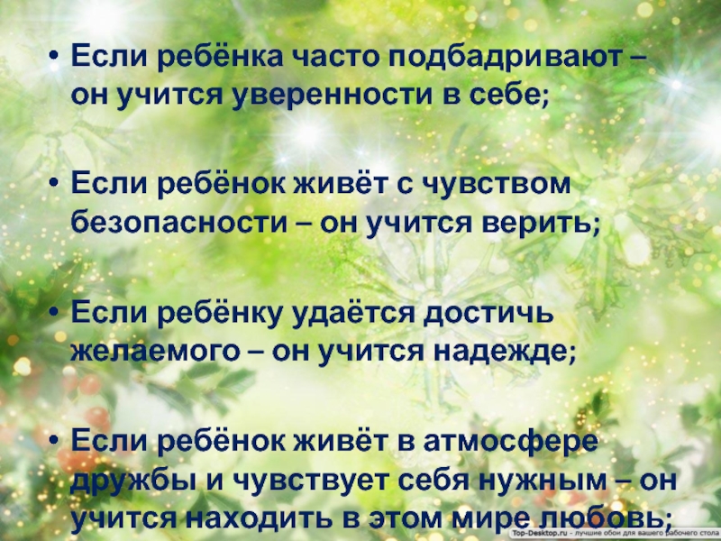 Если ребёнка часто подбадривают – он учится уверенности в себе; Если ребёнок живёт с чувством безопасности – он учится верить; Если ребёнку удаётся достичь желаемого – он учится надежде; Если ребёнок живёт в атмосфере дружбы и