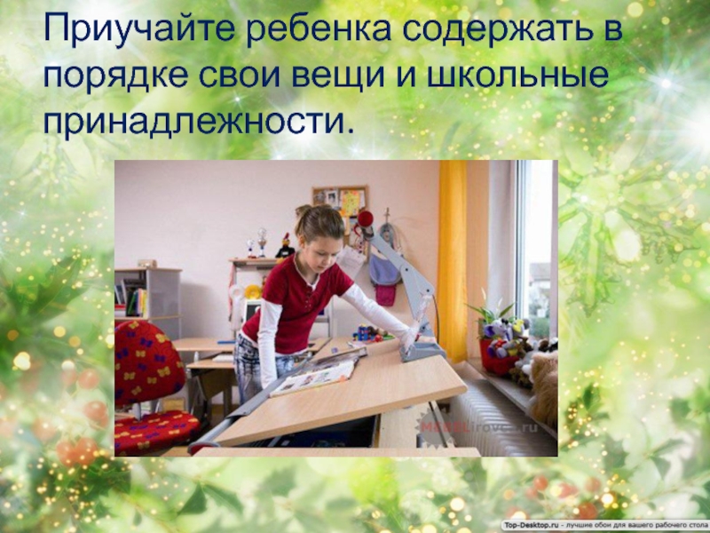 Слайд 6Приучайте ребенка содержать в порядке свои вещи и школьные принадлежности.