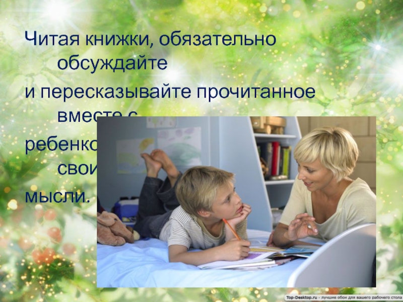 Читая книжки, обязательно обсуждайтеи пересказывайте прочитанное вместе сребенком; учите его ясно выражать своимысли.