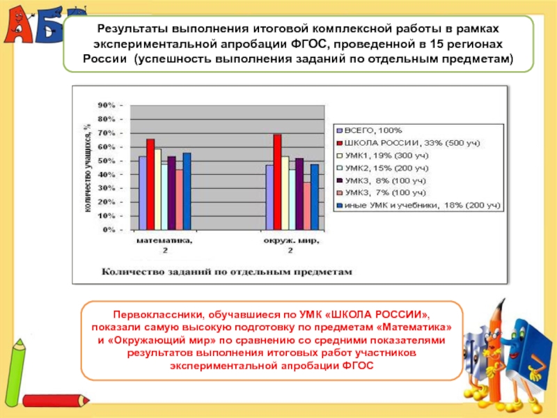 Первоклассники, обучавшиеся по УМК «ШКОЛА РОССИИ», показали самую высокую подготовку по предметам «Математика» и «Окружающий мир» по сравнению со средними показателями результатов выполнения итоговых работ участников экспериментальной апробации ФГОС