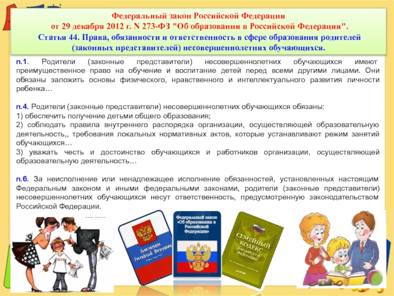 п.1. Родители (законные представители) несовершеннолетних обучающихся имеют преимущественное право на обучение и воспитание детей перед всеми другими лицами. Они обязаны заложить основы физического, нравственного и интеллектуального развития личности ребенка…