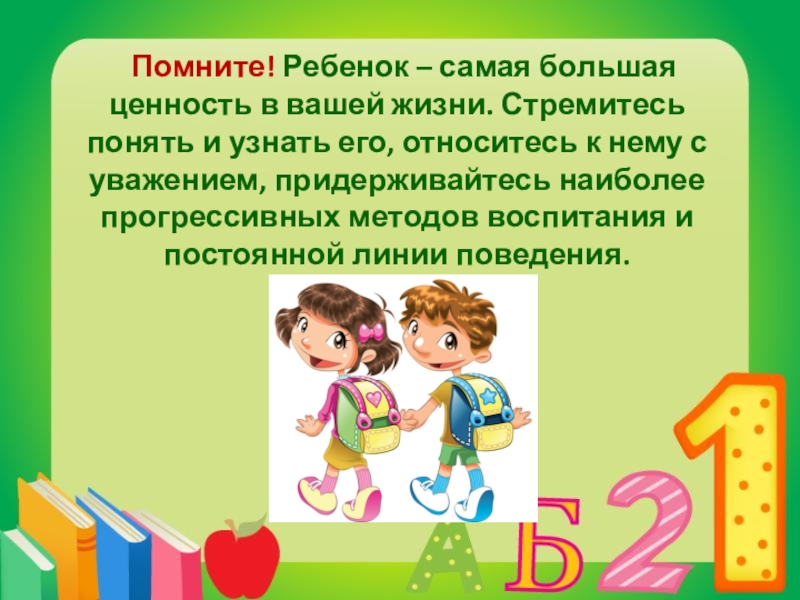 Слайд 15 Помните! Ребенок – самая большая ценность в вашей жизни. Стремитесь