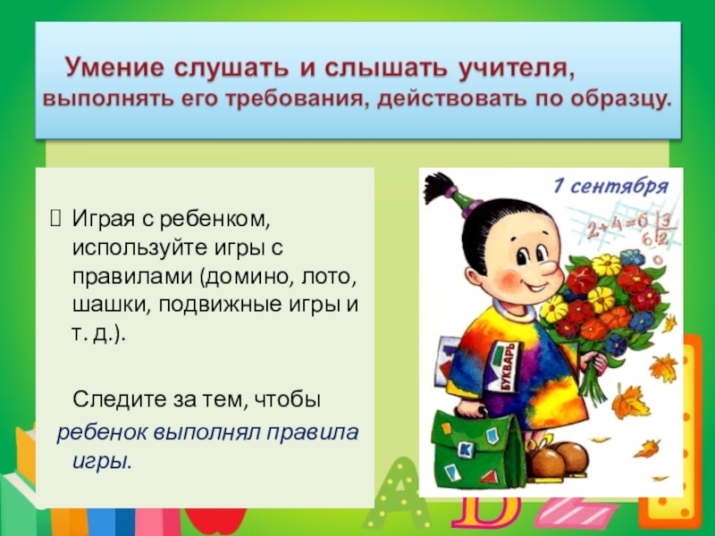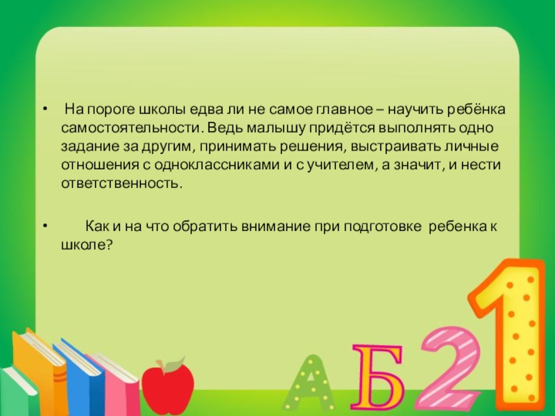 ребёнка самостоятельности. Ведь малышу придётся выполнять одно задание за другим, принимать решения, выстраивать личные отношения с одноклассниками и с учителем, а значит, и нести ответственность.