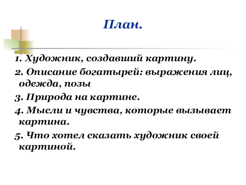 План.	1. Художник, создавший картину.	2. Описание богатырей: выражения лиц, 	одежда, позы	3. Природа на картине. 	4. Мысли и чувства,