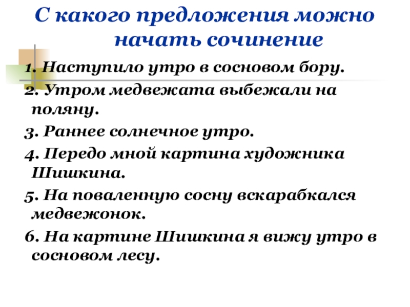 С какого предложения можно начать сочинение	1. Наступило утро в сосновом бору.	2. Утром медвежата выбежали на поляну.	3. Раннее