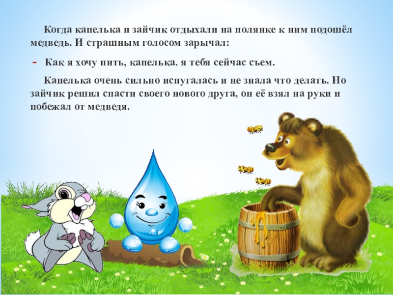 Когда капелька и зайчик отдыхали на полянке к ним подошёл медведь. И страшным голосом