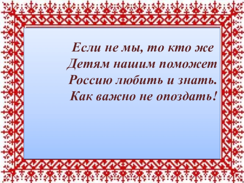 Если не мы, то кто же Детям нашим поможетРоссию любить и знать.Как важно