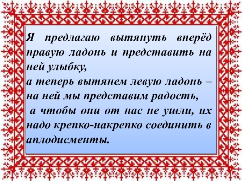 Я предлагаю вытянуть вперёд правую ладонь и представить на ней улыбку, а теперь вытянем левую ладонь –