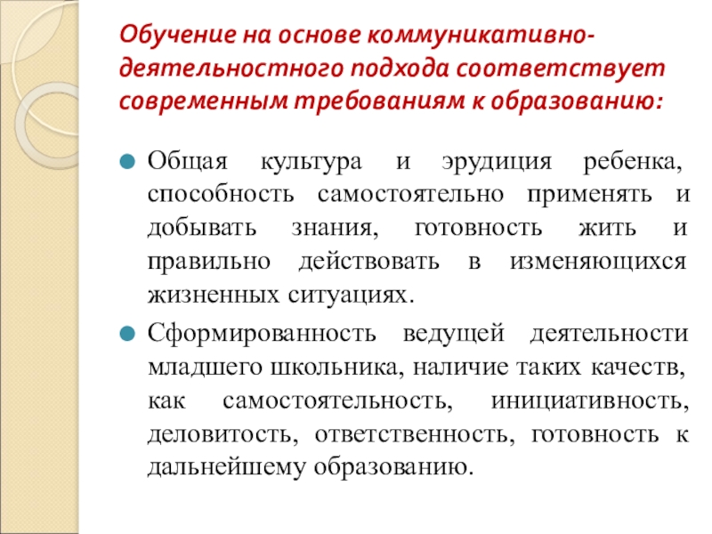 Обучение на основе коммуникативно-деятельностного подхода соответствует современным требованиям к образованию: