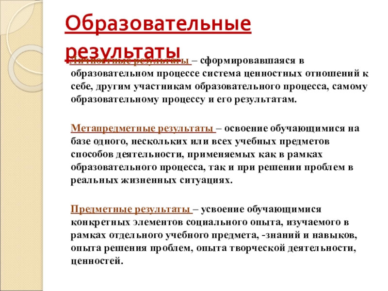 Предметные результаты – усвоение обучающимися конкретных элементов социального опыта, изучаемого в рамках отдельного учебного предмета, -знаний и навыков, опыта решения проблем, опыта творческой деятельности, ценностей.