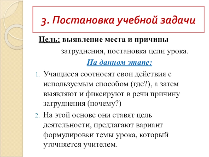 На этой основе они ставят цель деятельности, предлагают вариант формулировки темы урока, который уточняется учителем.