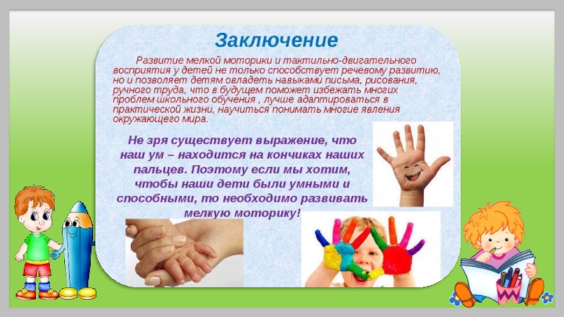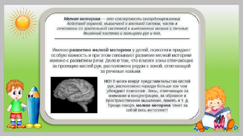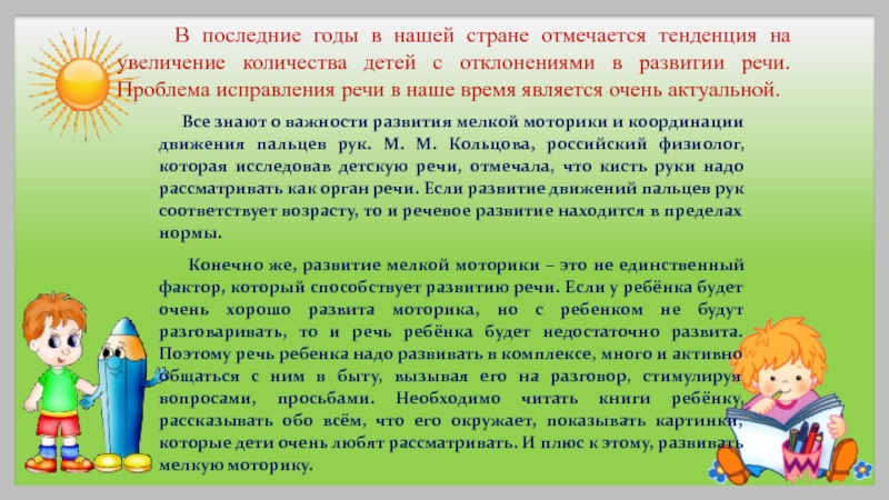Все знают о важности развития мелкой моторики и координации движения пальцев рук. М. М. Кольцова, российский физиолог, которая исследовав детскую речи, отмечала, что кисть руки надо рассматривать как орган речи. Если развитие движений пальцев рук соответствует возрасту, то и речевое развитие находится в пределах нормы.