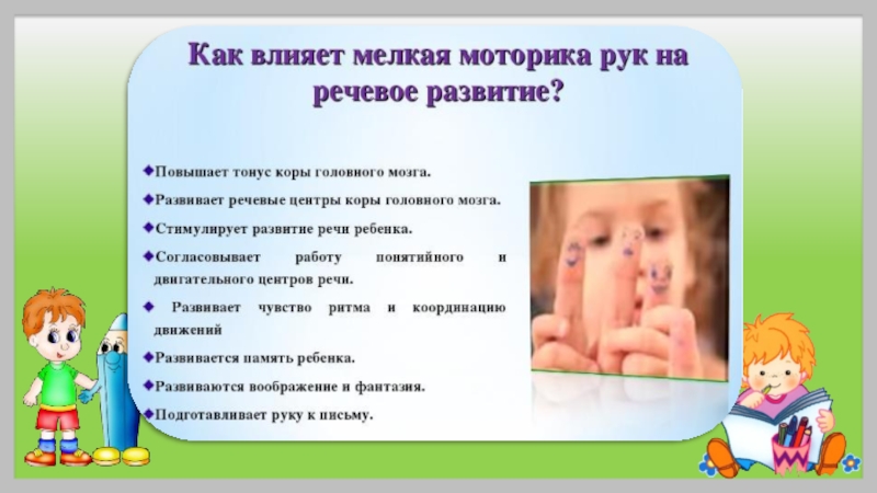 Конечно же, развитие мелкой моторики – это не единственный фактор, который способствует развитию речи. Если у ребёнка будет очень хорошо развита моторика, но с ребенком не будут разговаривать, то и речь ребёнка будет недостаточно развита. Поэтому речь ребенка надо развивать в комплексе, много и активно общаться с ним в быту, вызывая его на разговор, стимулируя вопросами, просьбами. Необходимо читать книги ребёнку, рассказывать обо всём, что его окружает, показывать картинки, которые дети очень любят рассматривать. И плюс к этому, развивать мелкую моторику.