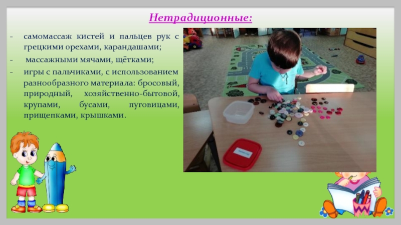 - самомассаж кистей и пальцев рук (поглаживание, разминание);