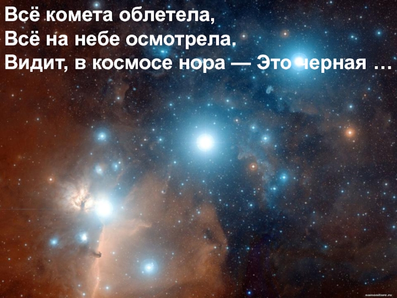 Всё комета облетела,Всё на небе осмотрела.Видит, в космосе нора — Это черная …