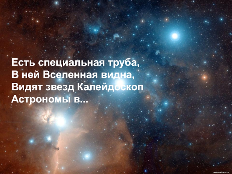 Есть специальная труба,В ней Вселенная видна,Видят звезд КалейдоскопАстрономы в...