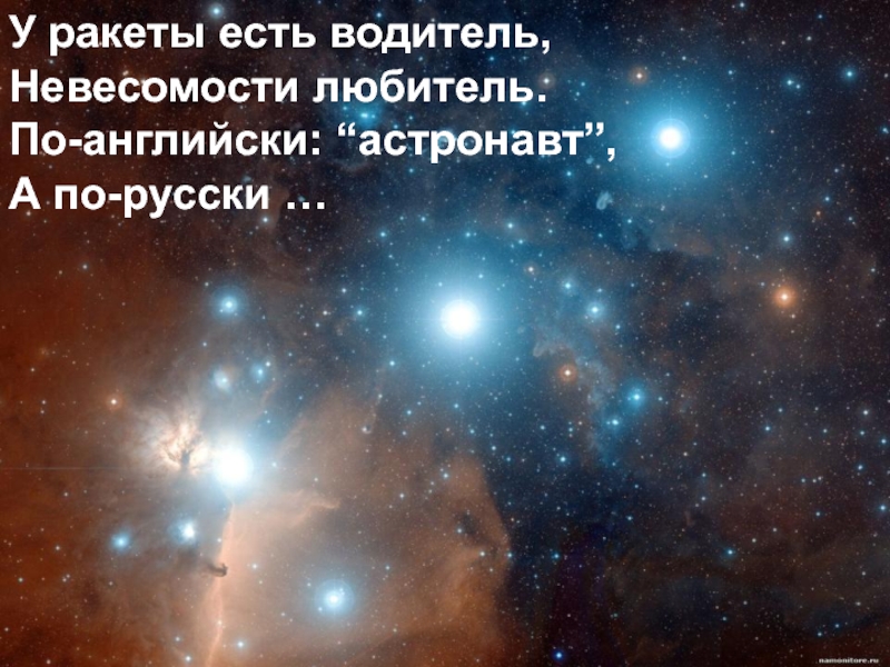 У ракеты есть водитель,Невесомости любитель.По-английски: “астронавт”,А по-русски …