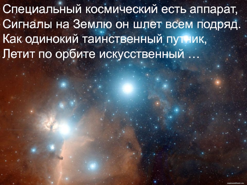 Специальный космический есть аппарат,Сигналы на Землю он шлет всем подряд.Как одинокий таинственный путник,Летит по орбите искусственный …