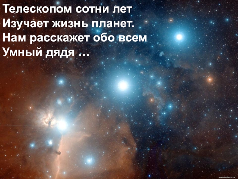 Слайд 24Телескопом сотни лет Изучают жизнь планет. Нам расскажет обо всем Умный дядя …