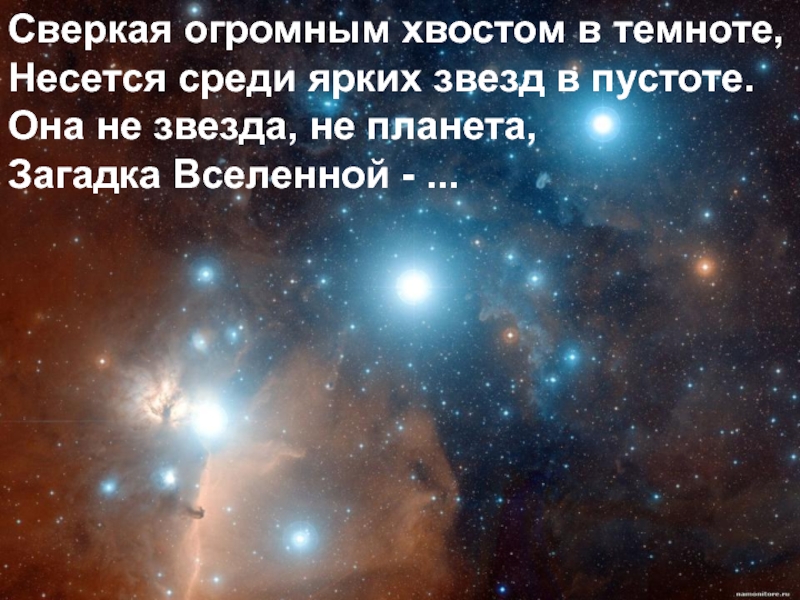 Сверкая огромным хвостом в темноте,Несется среди ярких звезд в пустоте. Она не звезда, не планета,Загадка Вселенной -