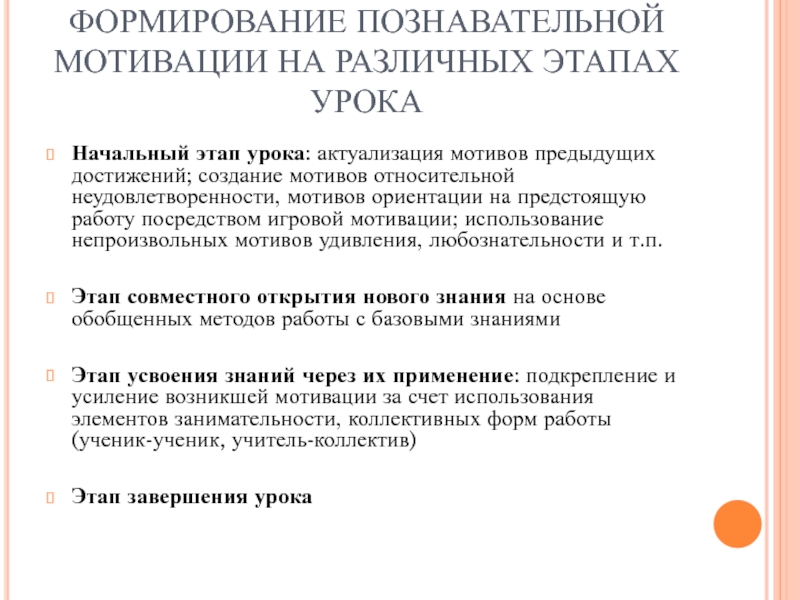 ФОРМИРОВАНИЕ ПОЗНАВАТЕЛЬНОЙ МОТИВАЦИИ НА РАЗЛИЧНЫХ ЭТАПАХ УРОКАНачальный этап урока: актуализация мотивов предыдущих достижений; создание мотивов относительной неудовлетворенности,