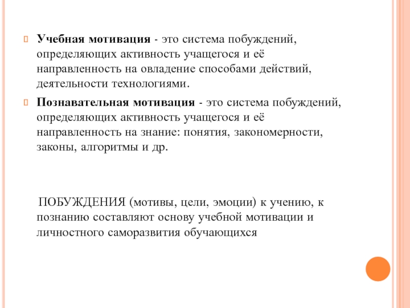 ПОБУЖДЕНИЯ (мотивы, цели, эмоции) к учению, к познанию составляют основу учебной мотивации и личностного саморазвития обучающихся