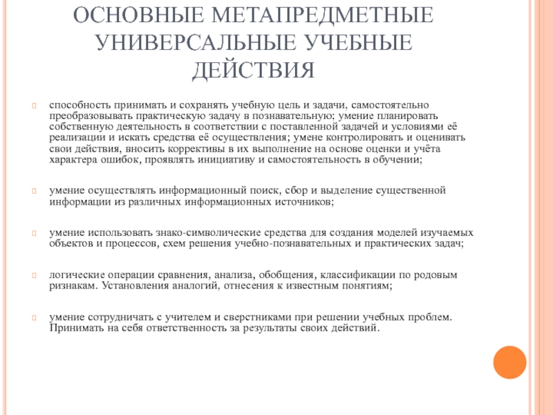 ОСНОВНЫЕ МЕТАПРЕДМЕТНЫЕ УНИВЕРСАЛЬНЫЕ УЧЕБНЫЕ ДЕЙСТВИЯспособность принимать и сохранять учебную цель и задачи, самостоятельно преобразовывать практическую задачу в