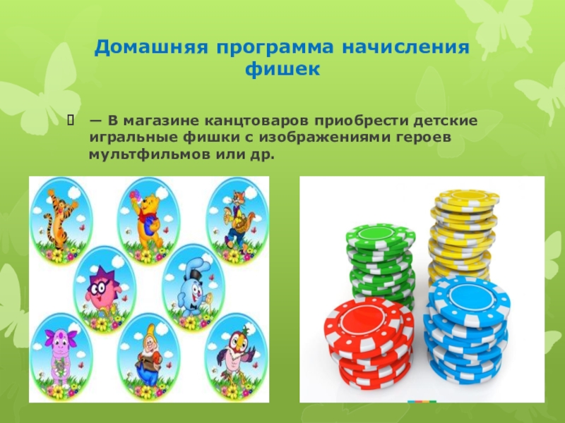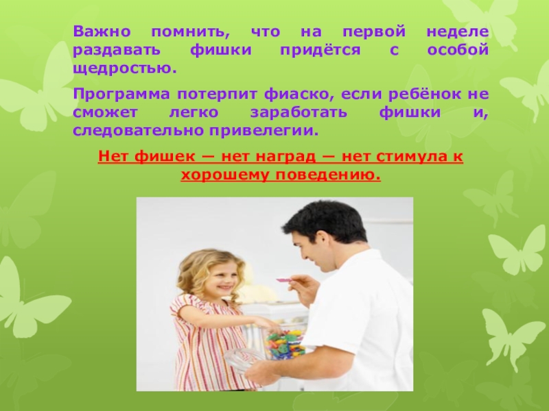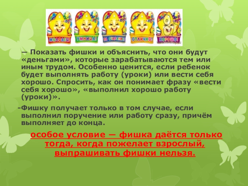 особое условие ― фишка даётся только тогда, когда пожелает взрослый, выпрашивать фишки нельзя.