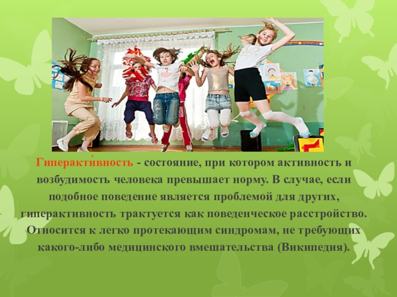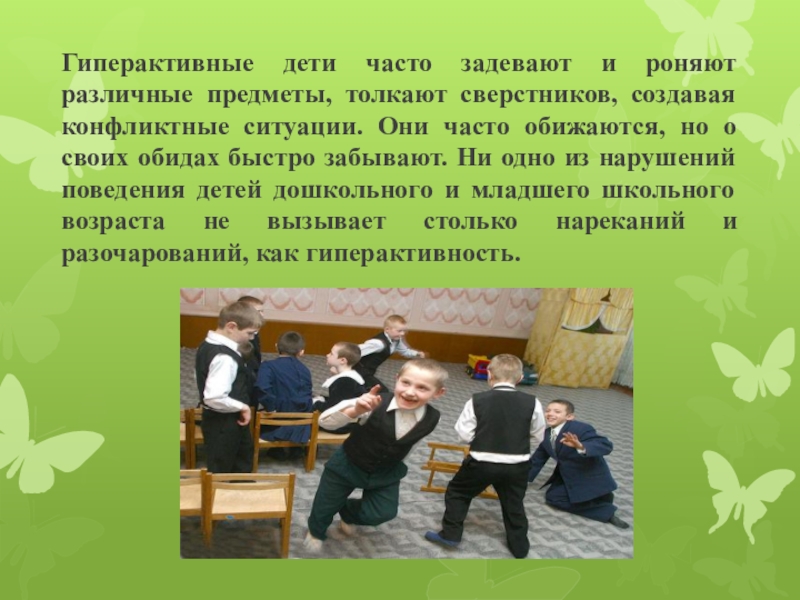 Слайд 3Гиперактивные дети часто задевают и роняют различные предметы, толкают сверстников, создавая