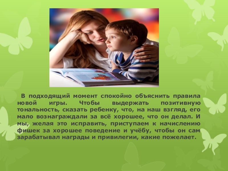 Чтобы выдержать позитивную тональность, сказать ребенку, что, на наш взгляд, его мало вознаграждали за всё хорошее, что он делал. И мы, желая это исправить, приступаем к начислению фишек за хорошее поведение и учёбу, чтобы он сам зарабатывал награды и привилегии, какие пожелает.