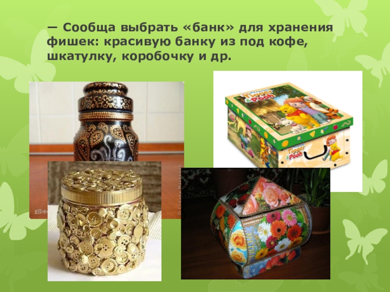 Слайд 13― Сообща выбрать «банк» для хранения фишек: красивую банку из под
