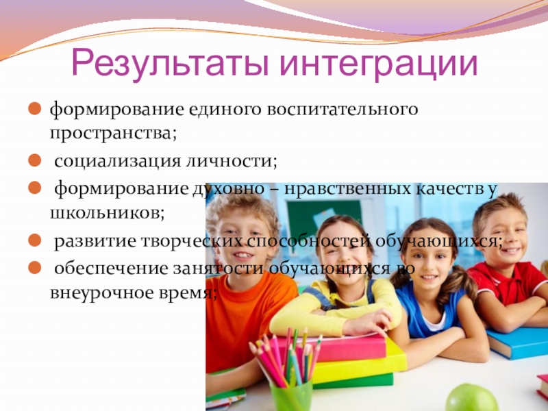 Результаты интеграцииформирование единого воспитательного пространства; социализация личности; формирование духовно – нравственных качеств у школьников; развитие творческих способностей