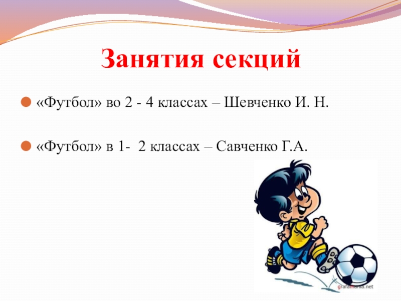 Занятия секций«Футбол» во 2 - 4 классах – Шевченко И. Н.«Футбол» в 1- 2 классах – Савченко