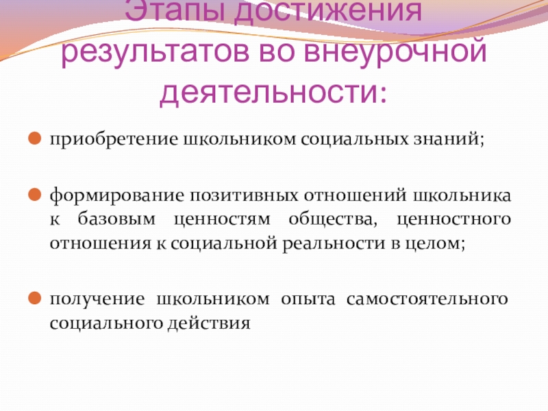 Этапы достижения результатов во внеурочной деятельности:приобретение школьником социальных знаний;формирование позитивных отношений школьника к базовым ценностям общества, ценностного отношения к социальной реальности в целом;получение школьником опыта самостоятельного социального действия