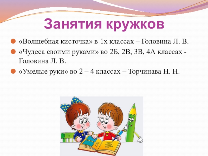 Занятия кружков«Волшебная кисточка» в 1х классах – Головина Л. В.«Чудеса своими руками» во 2Б, 2В, 3В, 4А